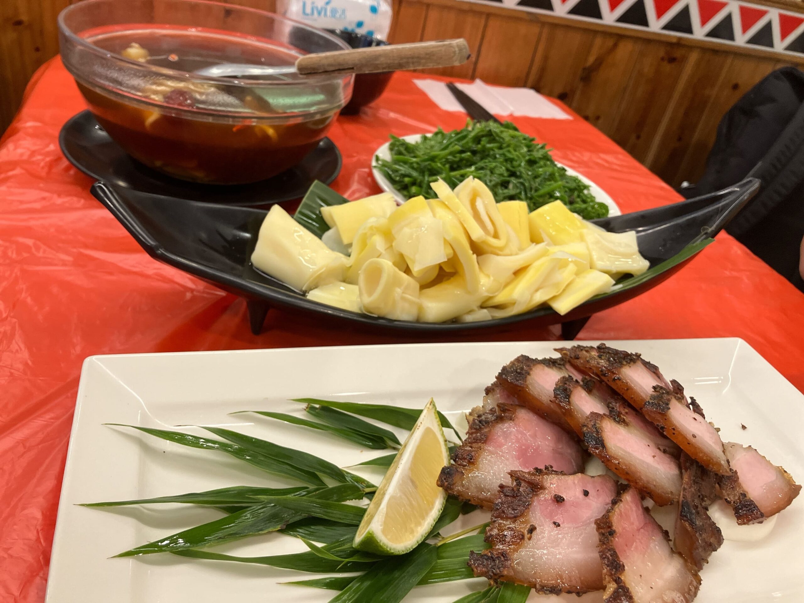 ちょうどお昼時に着いたので、原住民の料理が食べられるお店「日月潭新山味邵族風味餐庁」でお昼ご飯を食べました。セットを注文し、部族猪肉、野菜の炒め物(ちょっと野菜の種類がわからなかったです)、蒸したタケノコなどを食べました。